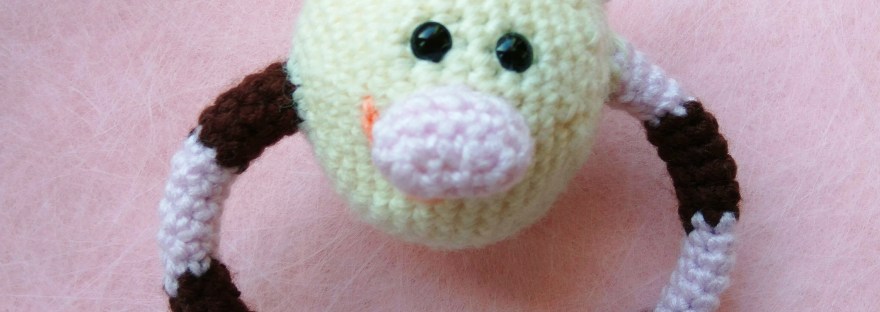 Oh, this wonderful moment, when your baby starts not only to hold toys but to take them from you! Finally you can really play with him or her! Is it possible to teach a baby to take toys or does it happen by itself? I don’t know, but I am sure that a baby takes a toy only if it really wants the toy! And of course it has to be able to hold the toy (little hands are soo small!). A thin ring with a funny face is what you need right now! And again, there is no better toy that the one which is made by the mom!