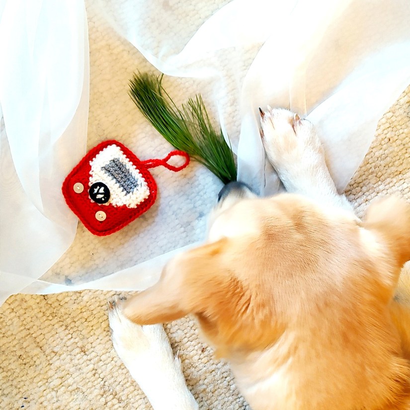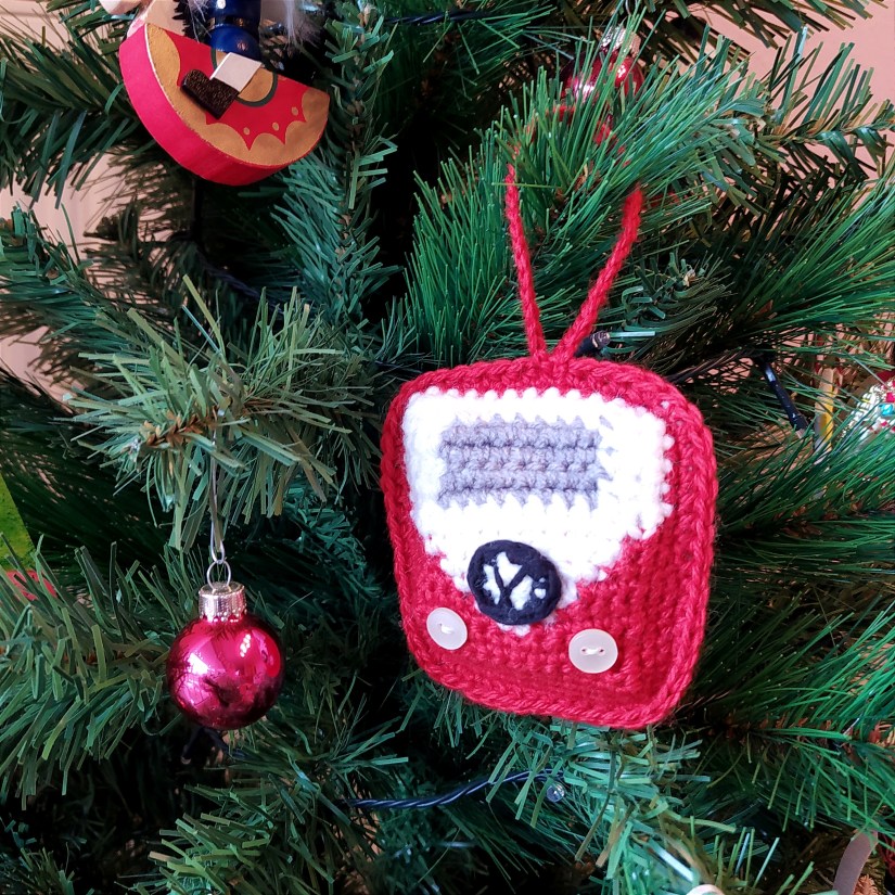 Insert the hook in the central stitch of the top side of the van, make 35 ch, sl st to the beginning of the chain (or the next stitch of the van side if it looks more symmetrical). Fasten off, cut the yarn and weave in the tail. Yeeey, you have just completed your camping van ornament!