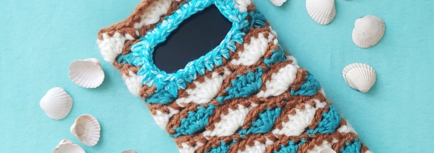 Round 17, blue yarn: 2 ch, 2 dc in the same st, (shell in the st between two next shells of the previous round, sc in the central dc of the next shell of the previous round) X 4, 3 dc in the last st, change to brown yarn, 1 ch, turn (30) – here will be a space for the phone on button.