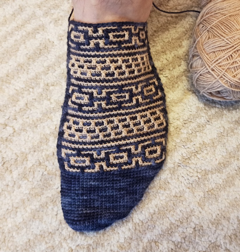 Round 21, blue: Insert the hook in 11th st of the round (space between 2nd and 3rd shells) and crochet 4 more shells and following sc’s, change to brown yarn, 1 ch, turn (20)